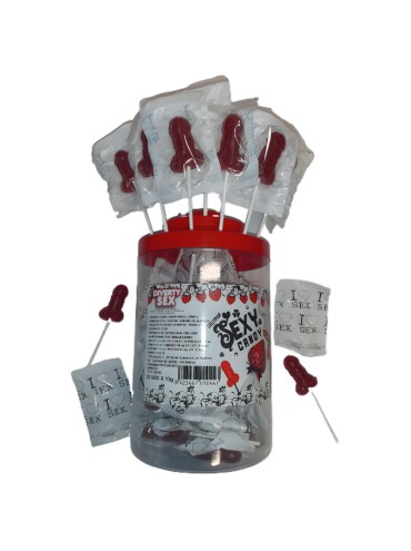 BOTE EXPOSITOR CON 50 PIRULETAS CON FORMA DE PENE DE CARAMELO CON SABOR A FRESA Y CEREZA